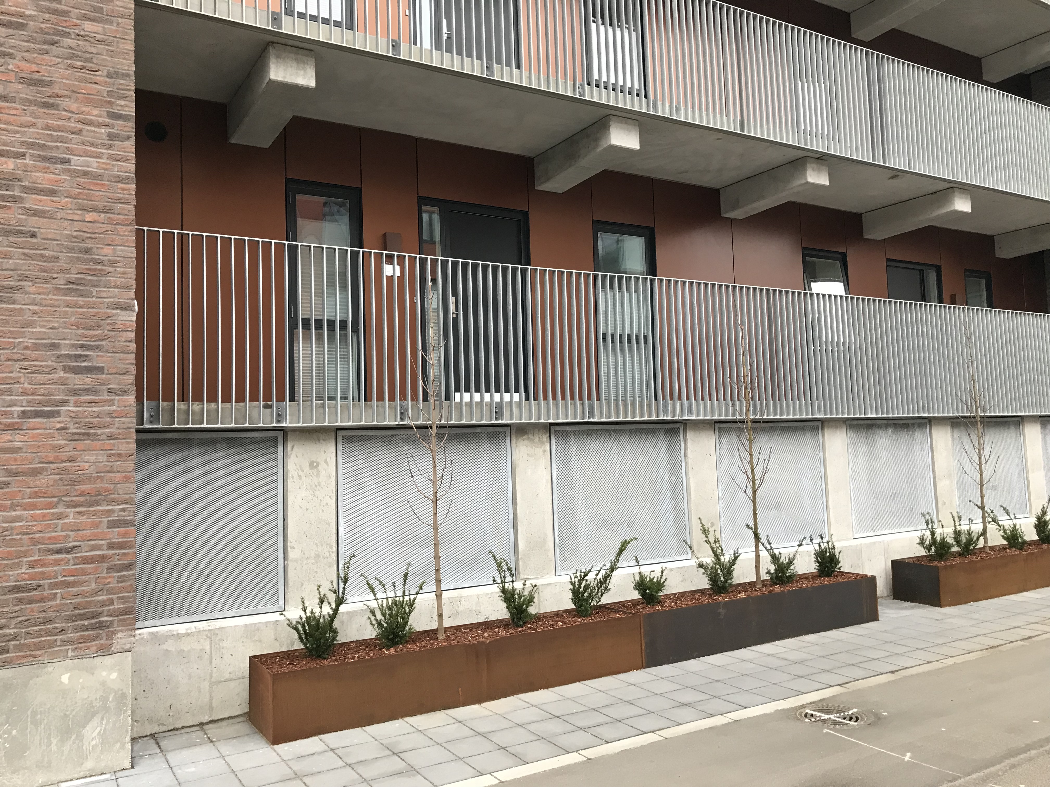 Alucobondplattorna är limomade på fasaden. Dette tillför ett plant och rent uttryck, som framhäver såvel plåtarnas gyllenbruna färg som de geometriske linjerna som är emellan dem.
