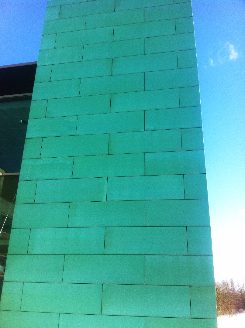Ny fasad klädd med TECU Bond Patina. Plåtarna är limmade direkt på aluminiumprofiler, så att fasaden ser 'ren' och plan ut. 200 m2 plåtar levererade.