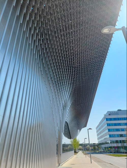 Till detta projekt i Stockholm har vi levererat borstad Alucobond och borstade aluminiumrör med samma ytfinish som fasadskivorna. Montage har gjorts både exteriört som interiört och utmaningen har varit att leverera aluminiumrören monteringsfärdiga i längdordning utefter ett visst system.