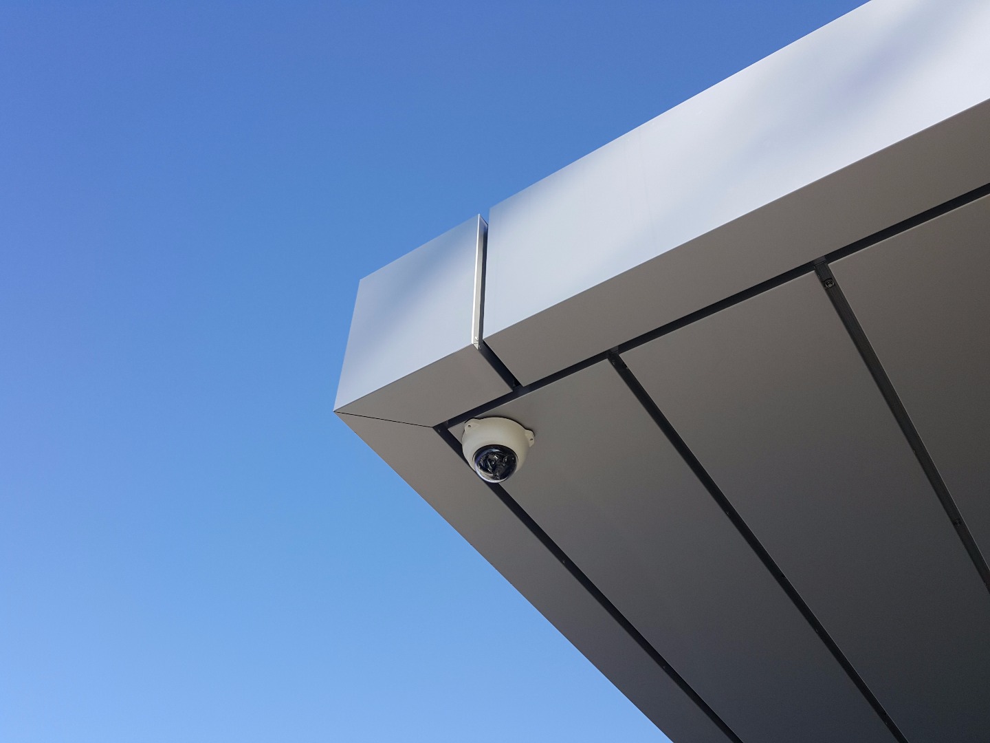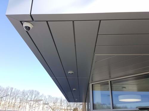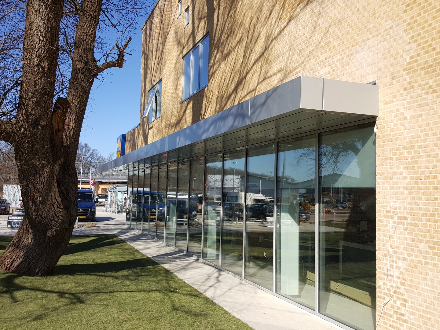 Yttre fasad, tak runt butikens entré och fönstrer beklädda med Alucobond-kassetter i färgen Silvermetallic 500.