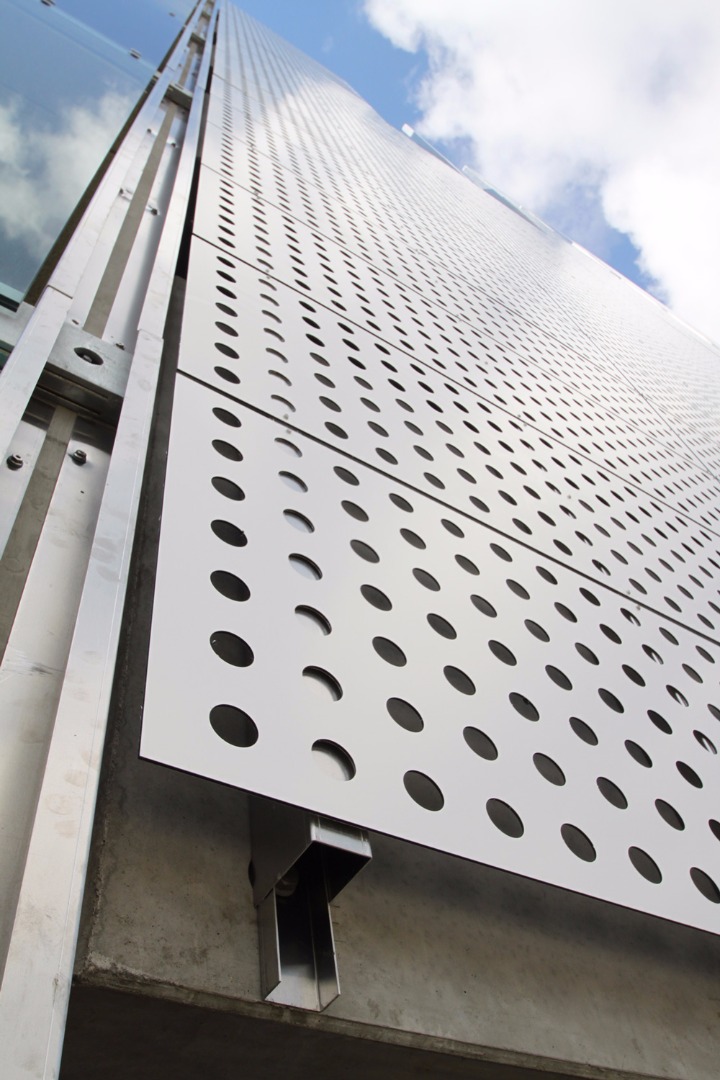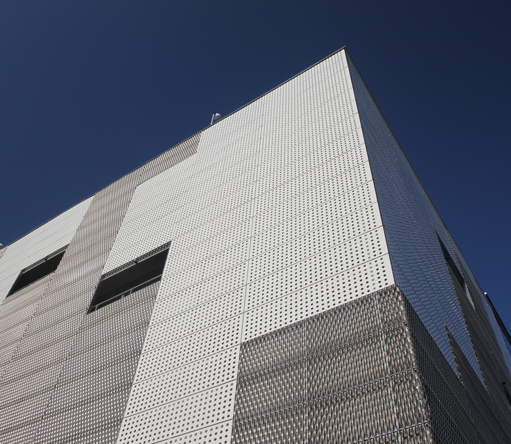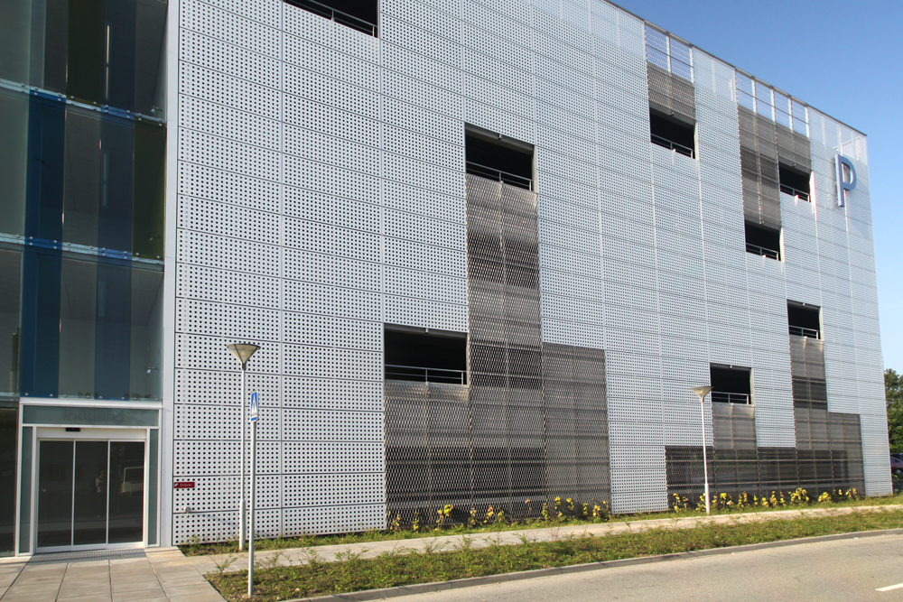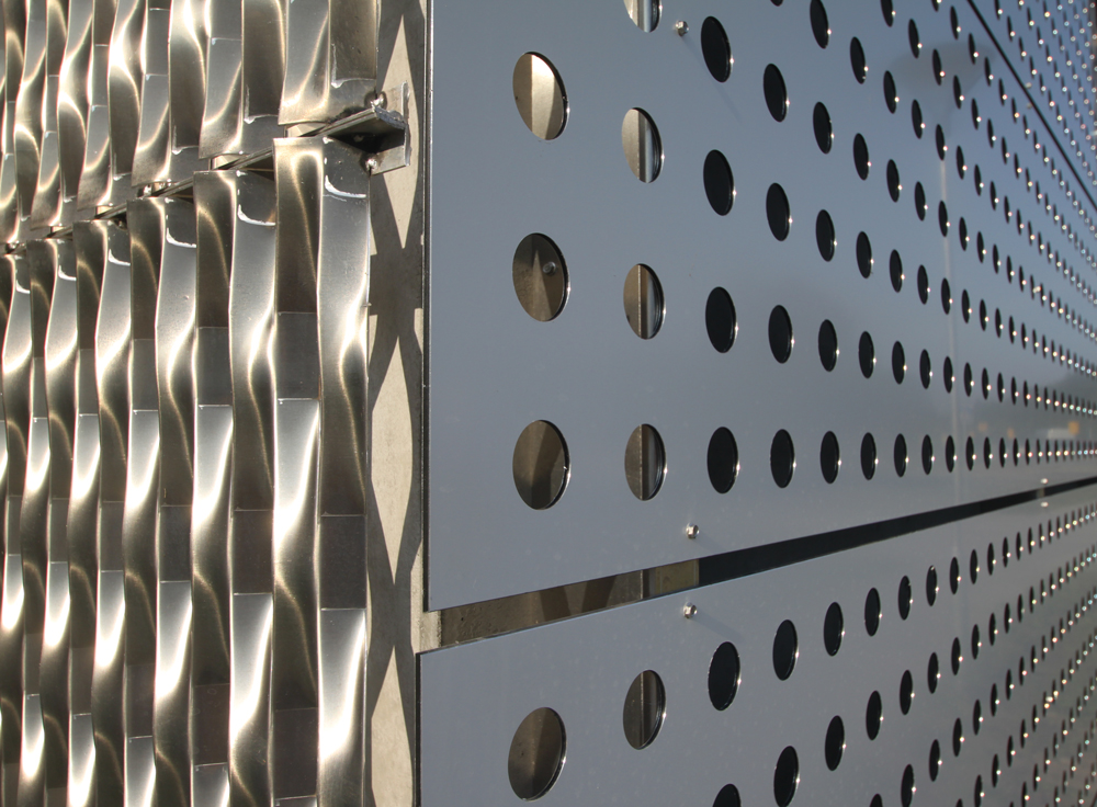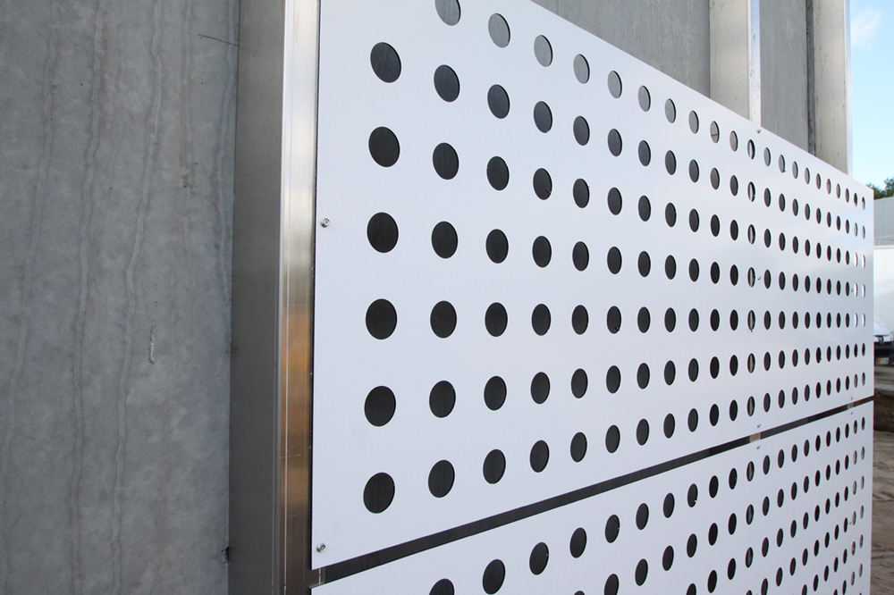 Årstiderne arkitekter valde ALUCOBOND-skivor för fasadbeklädnaden. Ca 700 m2 perforerade Alucobond-skivor i PE-kvalitet levererades. Dessutom används tre slags aluminiumprofiler i legering EN AW-5754 (korrosionsbeständigt) som stöd för skivorna.