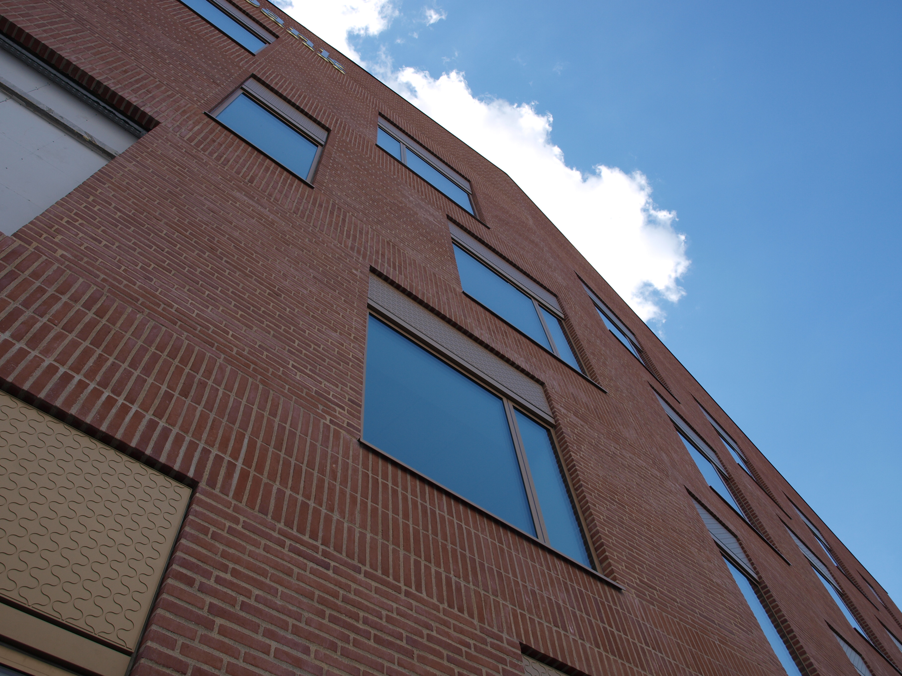 Den lokala banken i Odense, Danmark är byggd i röd tegelsten med inbyggt solskydd i alla fönster. Alumeco Bygg har levererat plåtar med spårat mönster till Blitek A/S som monterat dessa för NJ Gruppen A/S. Spåren som är 5mm breda och 2,5mm djupa utgör ett mönster som gör att det blir en kontrast från den övriga tegelstensbyggnaden. På baksidan av plåtarna, längs med kanterna är z-profilerna i 2 mm svetsade i samma legering som plattorna. Allt är pulverlackerat i IGP Braun Classic 32. Färgen imiterar en anodiserad yta och ger objektet en gyllene färg.