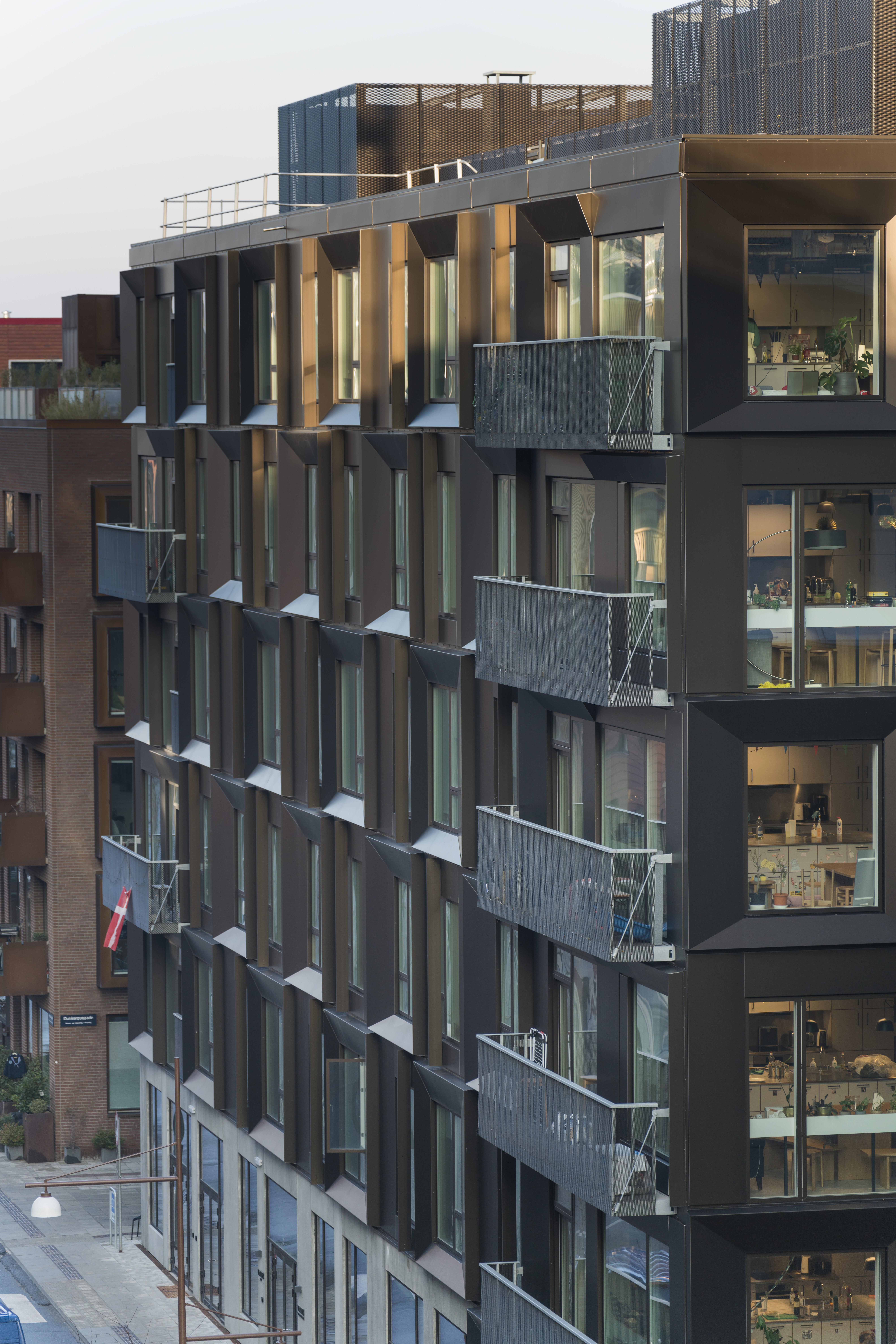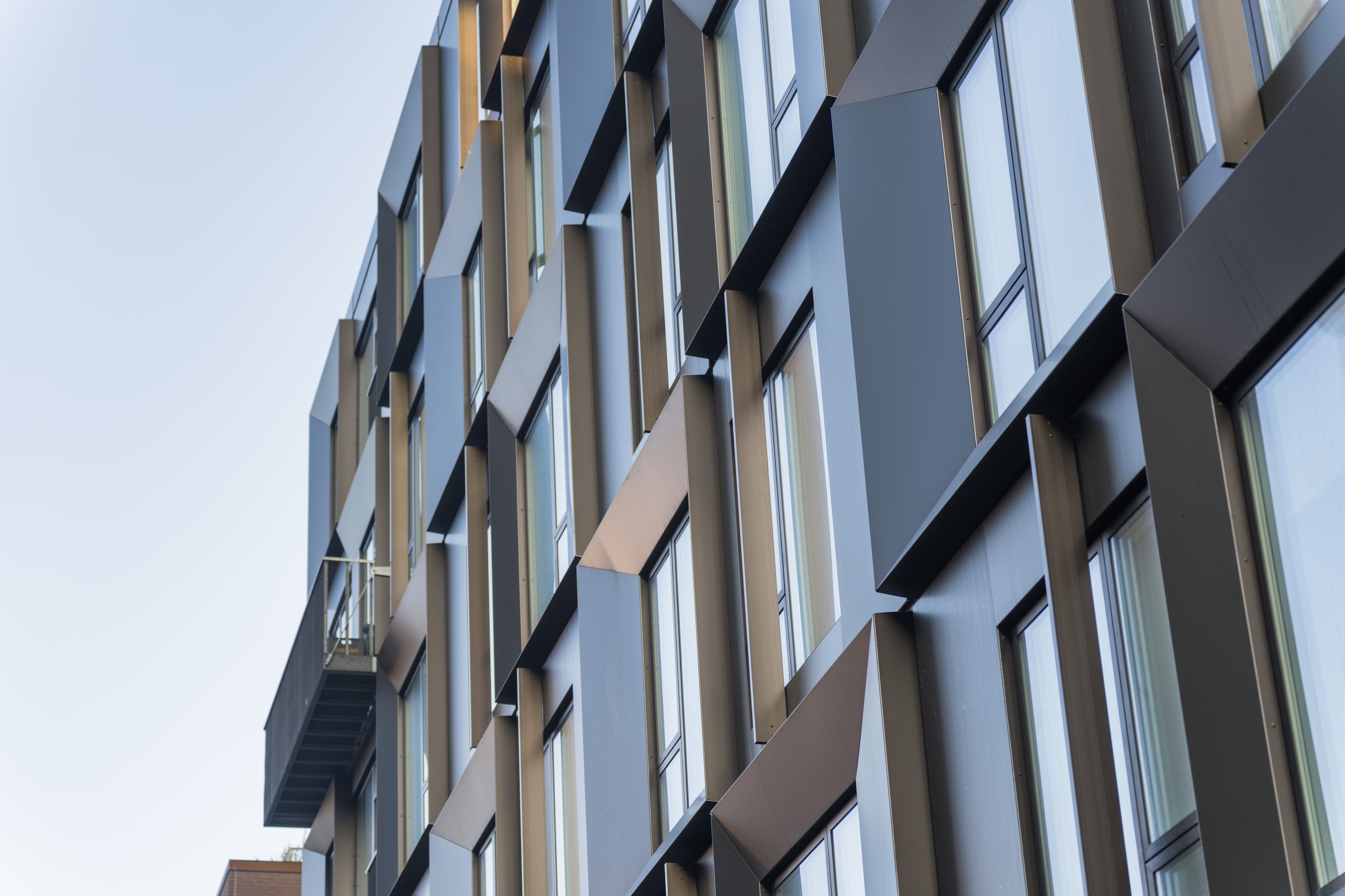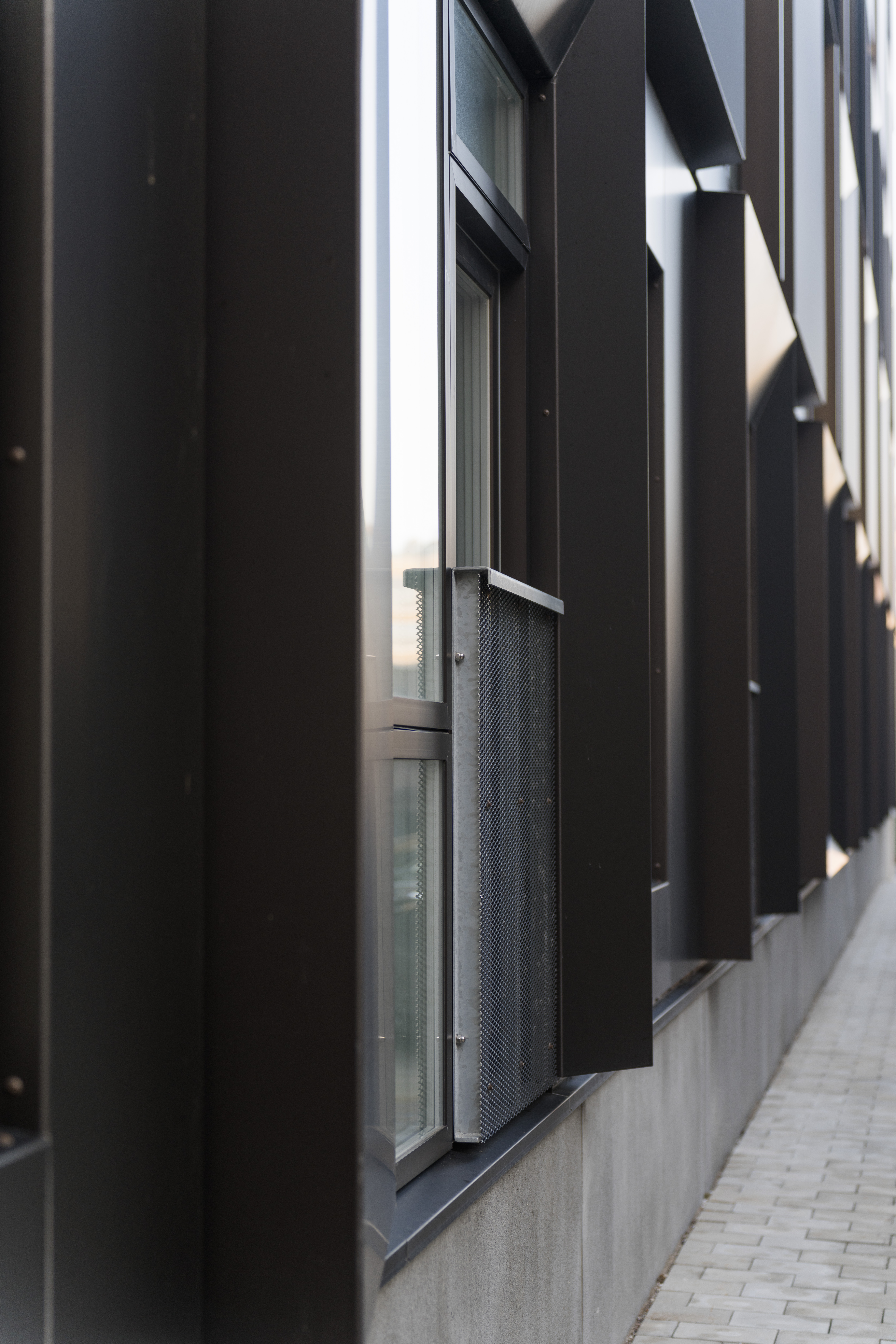 Vi har levererat plana plåtar som är bockade och monterade på fasaden. Plåtarna är anodiserade i färgen Dark Bronze. Färgen har en varm och neutral kulör och plåtarna är bockade och monterade på ett sätt som gör att fasaden får ett lek- och livfullt uttryck.