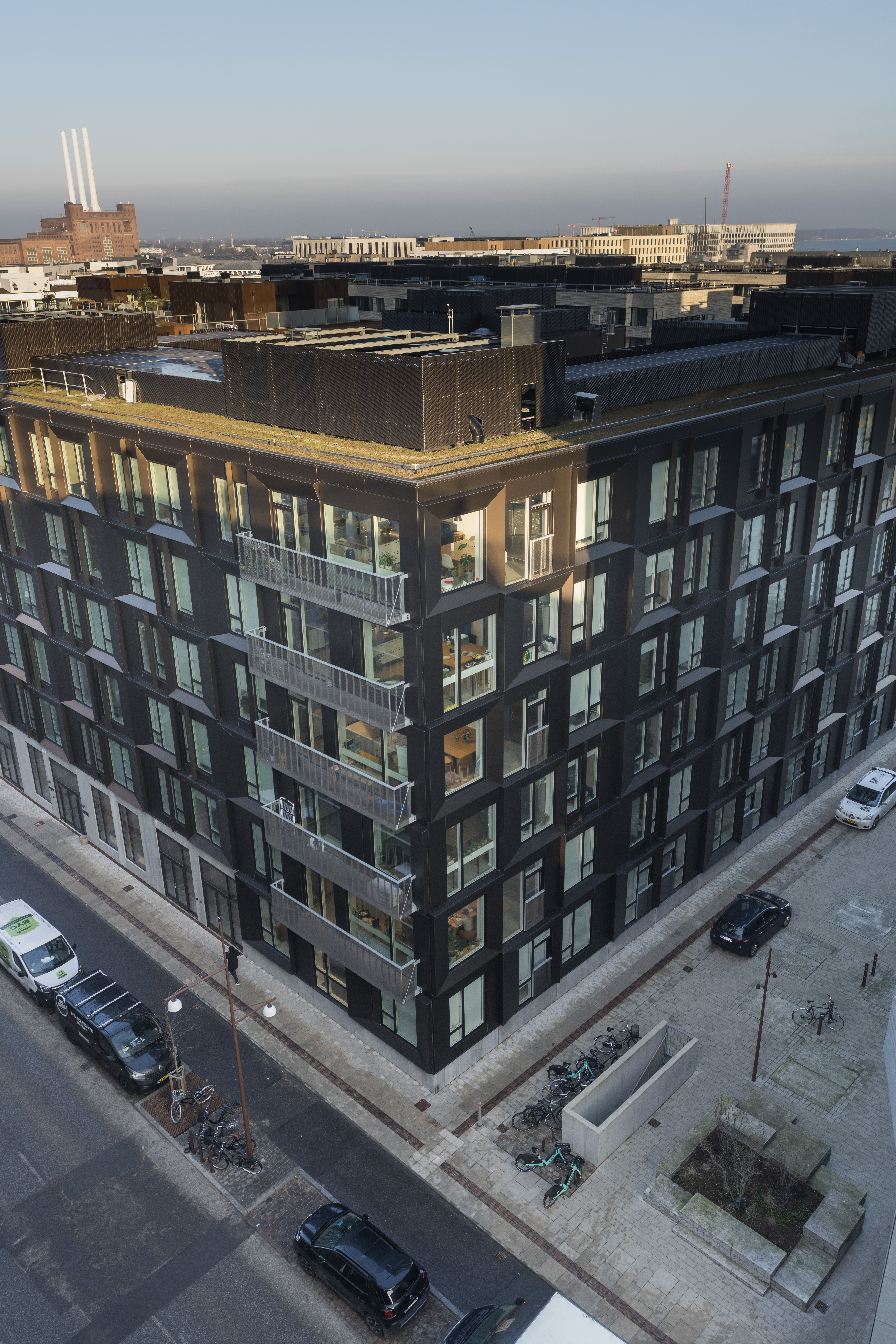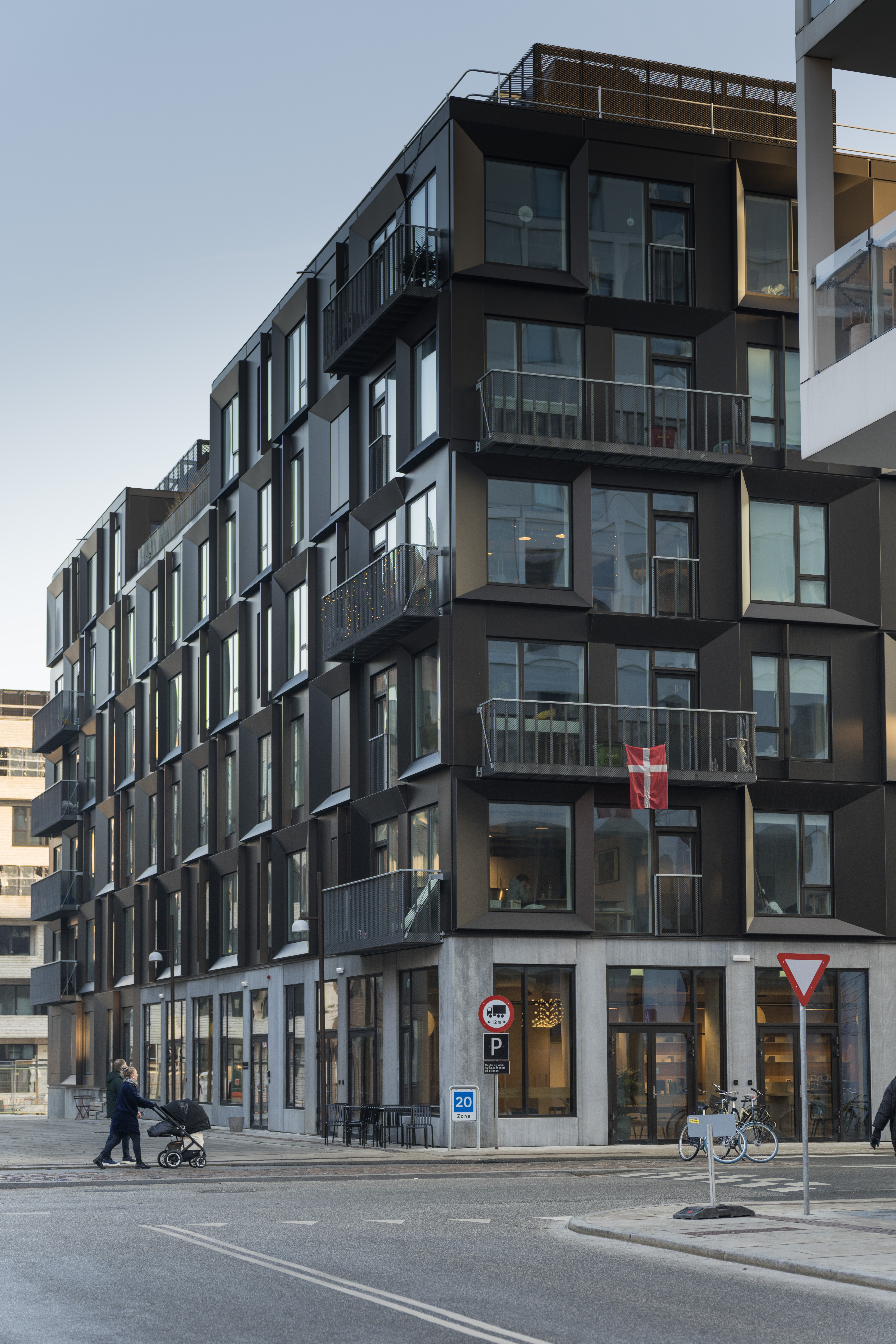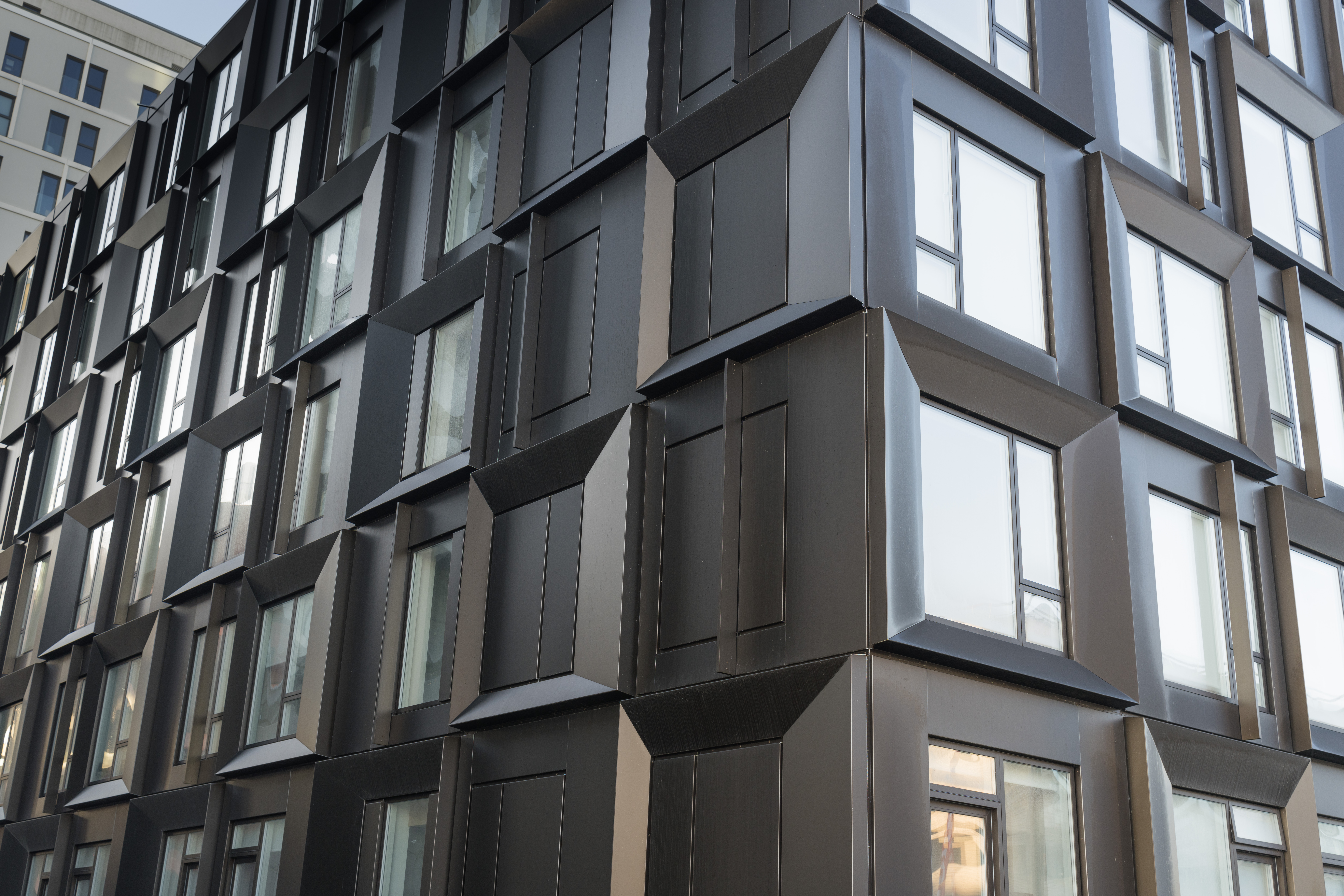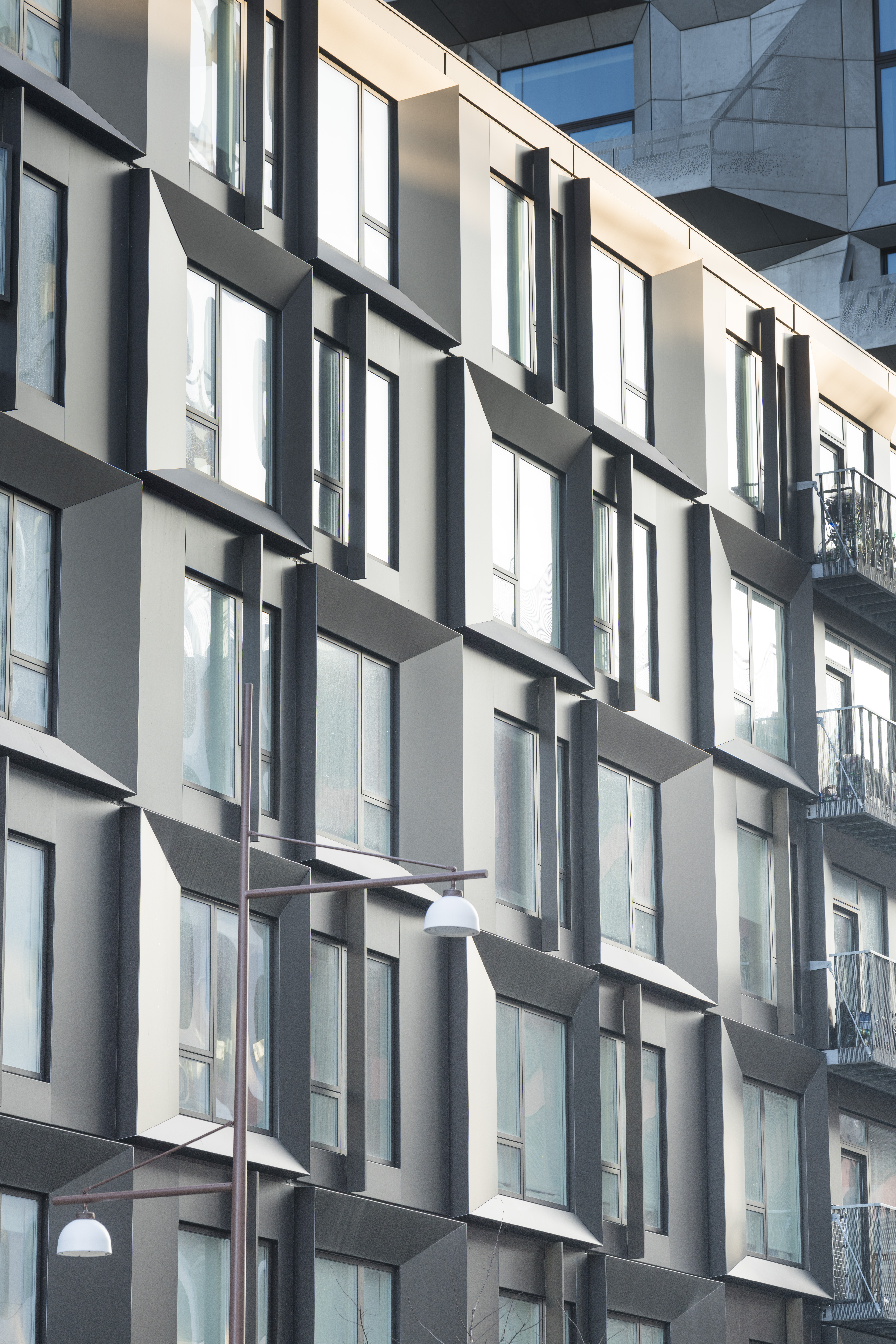 Vi har levererat plana plåtar som är bockade och monterade på fasaden. Plåtarna är anodiserade i färgen Dark Bronze. Färgen har en varm och neutral kulör och plåtarna är bockade och monterade på ett sätt som gör att fasaden får ett lek- och livfullt uttryck.